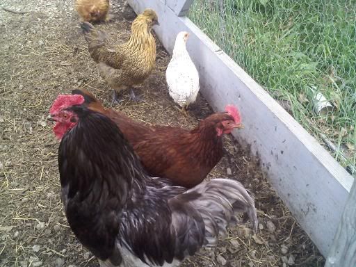 some of the Kids.. a Silver Leghorn, a Rhode Island Red, a Rock Cross, and a Buff Pencil Laced Wyandotte x Silkie