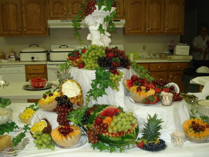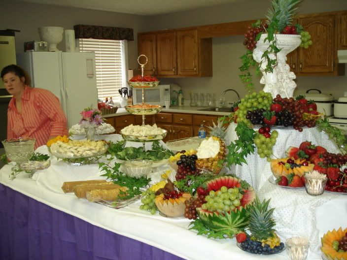 Here's what some of our food table looked like....my pastor's wife did the fruit statue..