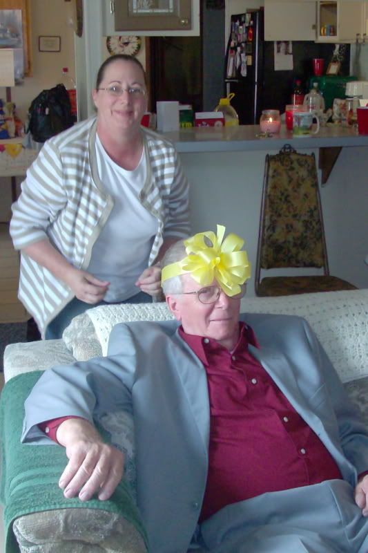 This is at Sis Coles Surprise Birthday party at Anns house. This is Bro Loyd, he was asleep, so Ann put the bow on his head, and he woke up. (I had dared her to ;) )