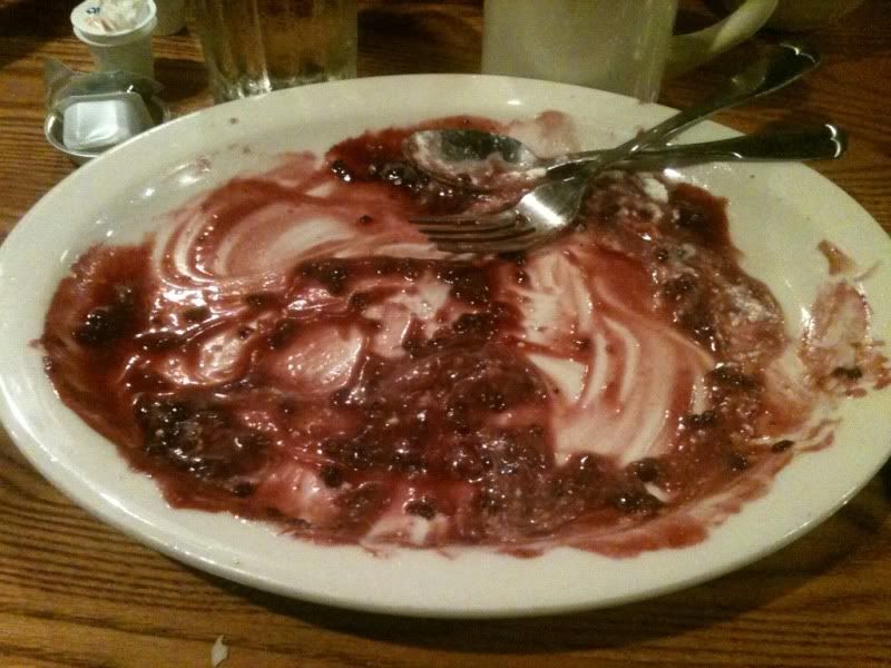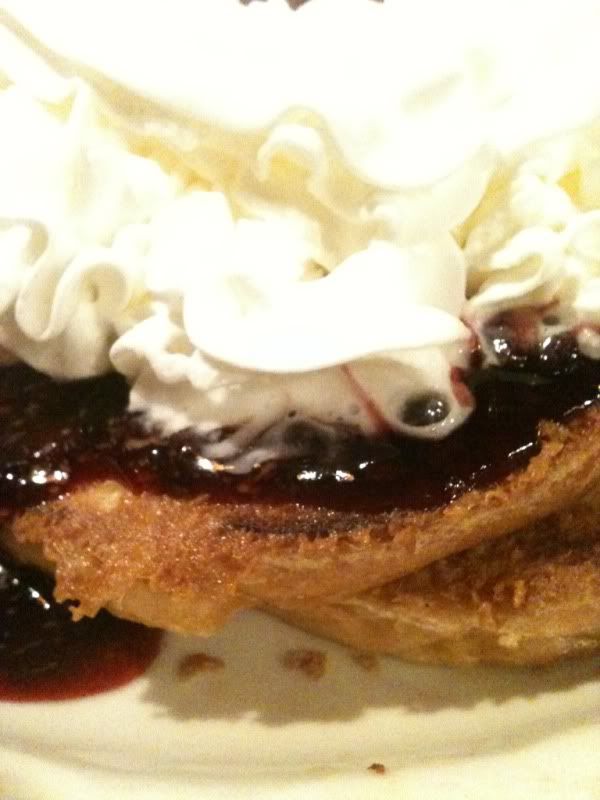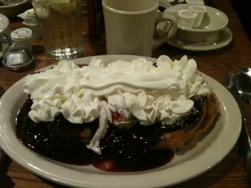 I got y'all beat! We went to cracker barrel, and I hadn't eaten since breakfast, so I ordered some very awesome looking French toast! Four pieces of sourdough bread cooked to perfection, topped with blackberries and whipped cream! YUMMY!